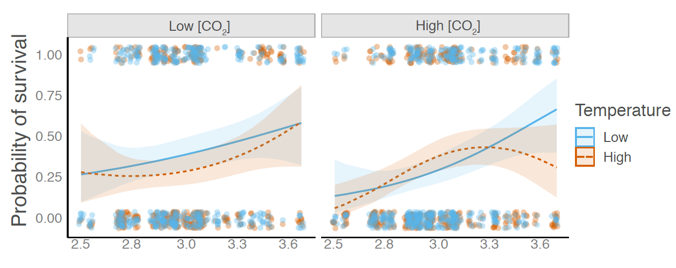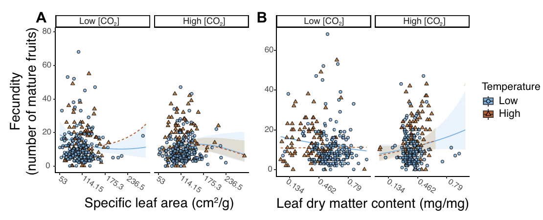 Elevated temperature and CO₂interact to shift the fitness landscape in Boechera stricta. Here, the combination of increased CO₂ and temperature shift the probability of survival to favor lower elevation populations.